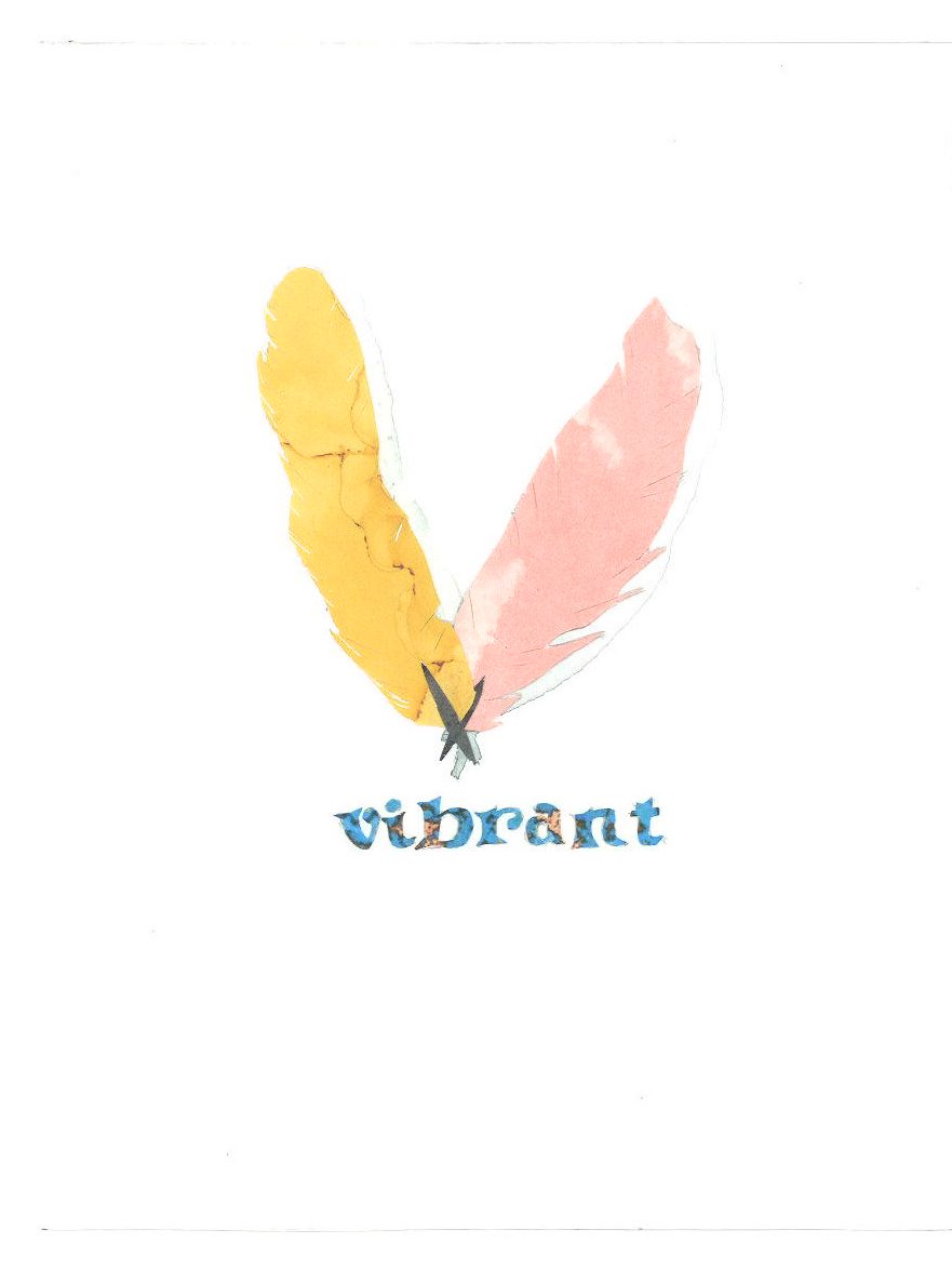 For this traditional illustration, I created a collage using an assortment of pieces of painted cut-outs as well as scrap book paper cut-outs. For the painted cut-outs, I used both watercolor and acrylic paints. After the original sketch was laid out, I used tracing paper, and carefully cut out, and pasted each piece to create a captivating image of the parrot. I also created a page prior, showing the letter “V” out of the created feathers. Each part of the first page showcased each color of the triadic color scheme.