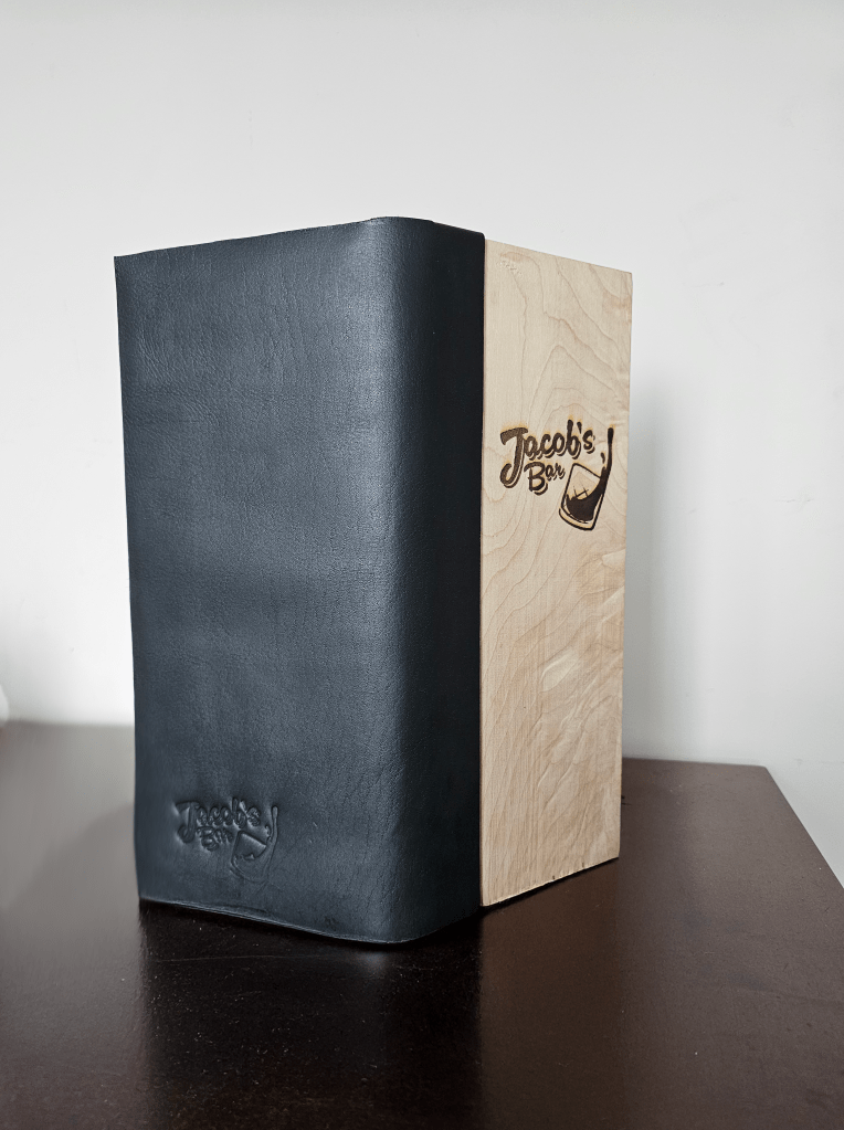 A handcrafted drink menu folio designed to bring character, craft, and functionality to a personalized home bar experience.
